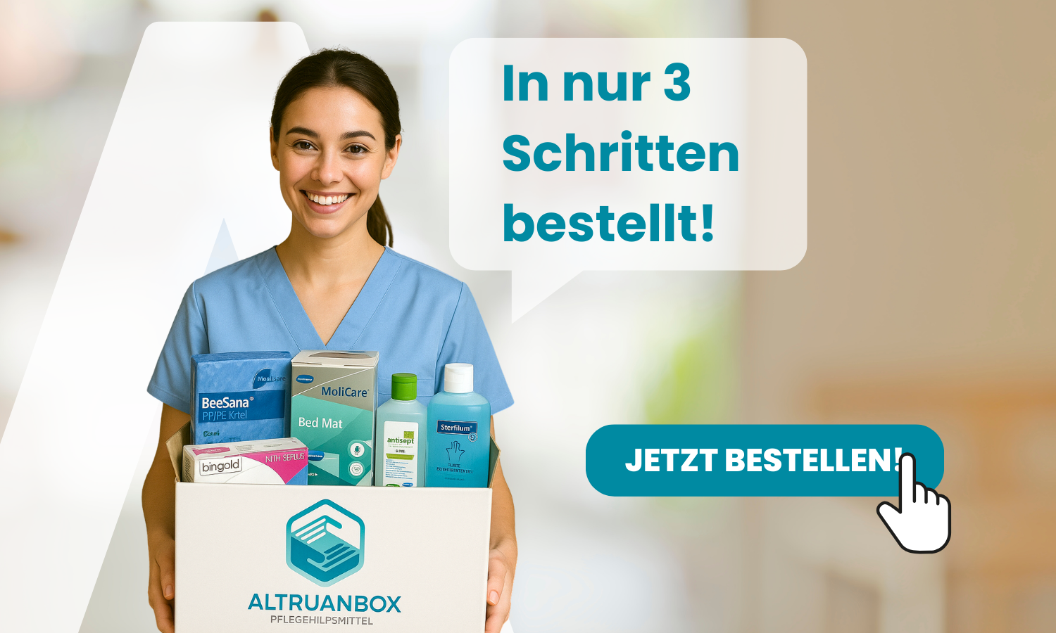 Εξασφαλίστε το νόμιμο δικαίωμά σας σε βοηθήματα φροντίδας σύμφωνα με το §40 SGB XI αξίας 42€. Το AltruanBox περιλαμβάνει μια ολοκληρωμένη υπηρεσία γύρω από το θέμα της οικιακής φροντίδας, της φροντίδας και των βοηθημάτων φροντίδας. Πρώτα απ' όλα, είναι ο άνθρωπος. Δίνουμε μεγάλη σημασία όχι μόνο στην ανακούφιση του ατόμου που χρειάζεται φροντίδα, αλλά και στην υποστήριξη των συγγενών.
