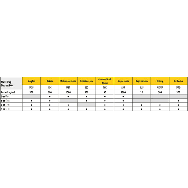 Mit dem CLEARTEST Multi Drug Discreet ECO erhalten Sie einen zuverlässigen, einfach anzuwendenden Urin-Drogentest mit flexibler Auswahl der getesteten Substanzen und schneller Ergebnisauswertung – ideal für vielfältige Einsatzbereiche und höchste Diskretion.